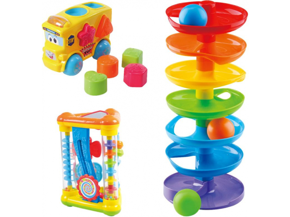 Ταξινομήστε τα σχήματα στο λεωφορείο, παίξτε με τις μπάλες που κυλάνε στον κυλινδρικό πύργο και ανακαλύψτε τα χρώματα και τα σχέδια στο τρισδιάστατο τρίγωνο.