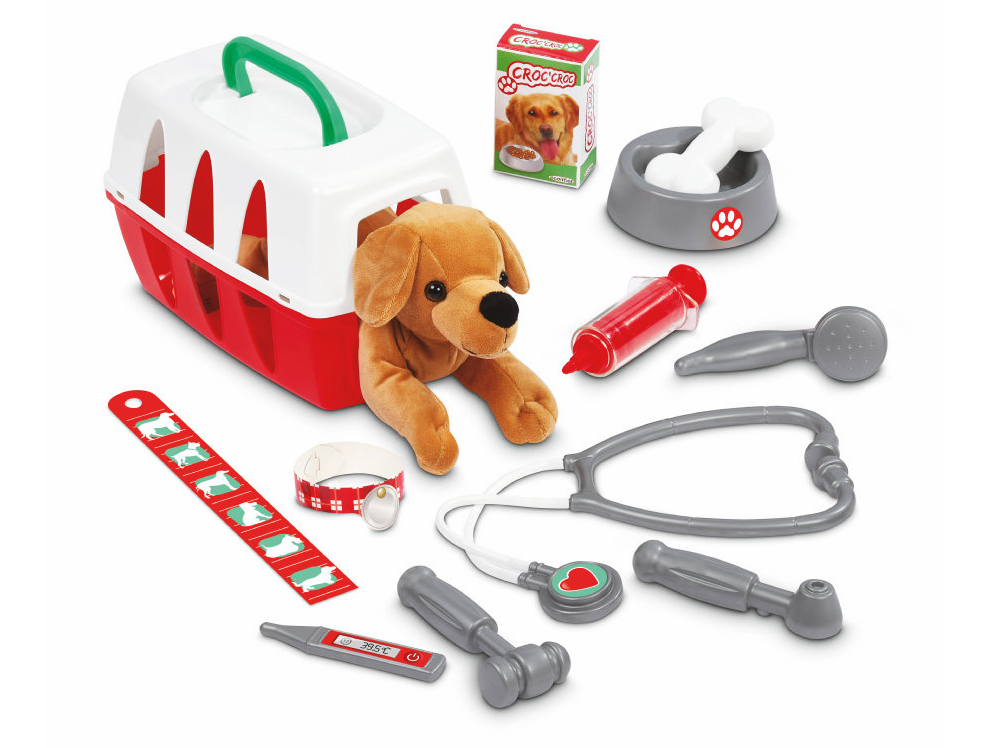 Αυτό το σετ περιέχει 1 κυλιόμενο εξεταστικό τραπέζι, 1 βελούδινο σκυλάκι και βαλίτσα μεταφοράς του, 1 μπολ, 1 κόκαλο, 1 σύριγγα με έμβολο, 1 αντανακλαστικό σφυρί, 1 ωτοσκόπιο, 1 κουτί κροκέτες.