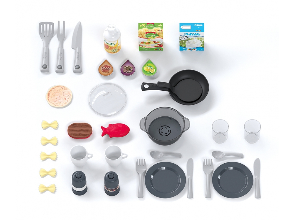 Καλά εξοπλισμένο με 34 αξεσουάρ: 3 σκεύη BBQ, 2 πιρούνια, 2 μαχαίρια, 2 κουτάλια, 2 πιάτα, 2 ποτήρια, 2 φλιτζάνια, 3 κάψουλες καφέ, 1 σόδα, 1 τηγάνι, 1 τηγανίτα, 1 κατσαρόλα, 1 καπάκι, 2 μύλοι αλατιού και πιπεριού, 5 ζυμαρικά ευαίσθητα στη θερμότητα, 2 πλαστά κουτιά και μαγικά ψάρια και μπριζόλα (μπορούν να ψηθούν με τις δύο χρωματικές πλευρές τους).