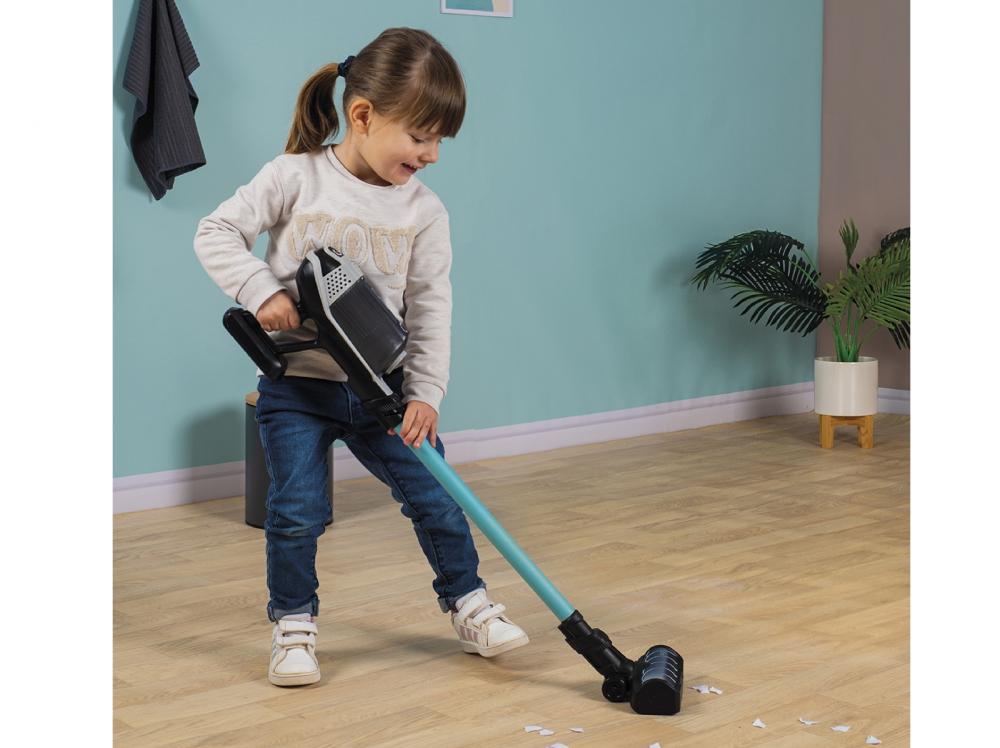 Με ένα πάτημα ενός κουμπιού, μπορείτε να ενεργοποιήσετε την ηλεκτρική σκούπα παιχνιδιών και να ακούσετε τον πραγματικό ήχο αναρρόφησης.