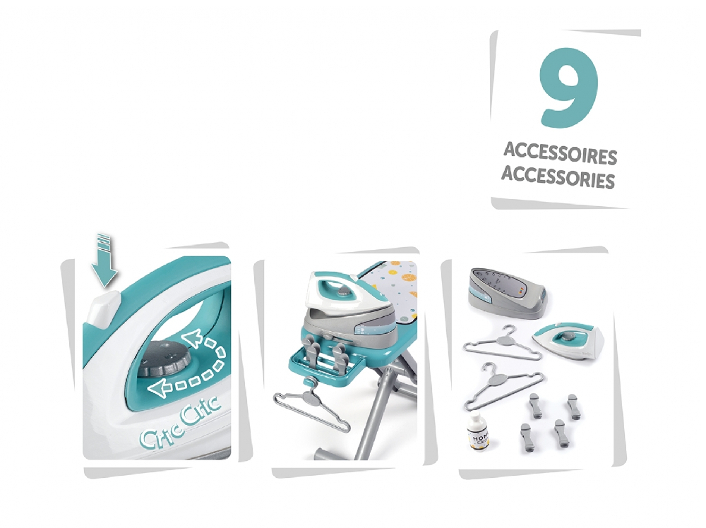 Περιλαμβάνονται τα αξεσουάρ: 1 φιάλη, 2 κρεμάστρες και 5 μανταλάκια για να κρεμάσετε τα ρούχα σας μόλις σιδερωθούν.