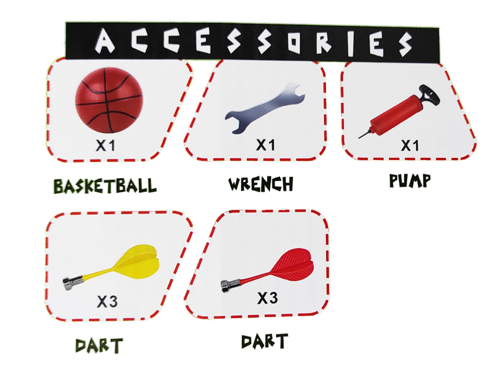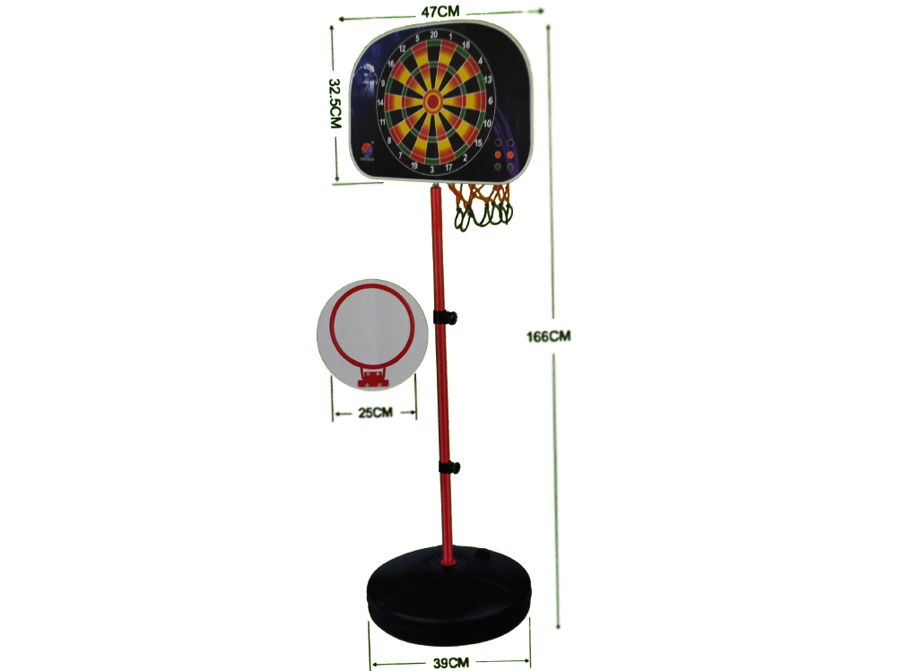 Περιέχει: ταμπλό, στεφάνι, μπάλα, βάση, τρόμπα, εργαλείο, 6 μαγνητικά βελάκια.