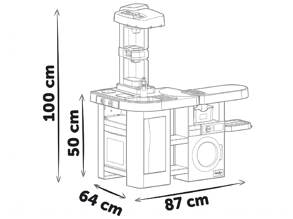 Ορισμένα μέρη δημιουργήθηκαν για να παρατείνουν το παιχνίδι: νεροχύτης με βρύση, φούρνος, ψυγείο, απορροφητήρας, μηχανή εσπρέσο, μηχανή σόδας, εστία με ηχητικά εφέ. Αλλά, η κουζίνα έχει επίσης ένα πλυντήριο με ανοιγόμενη πόρτα και ένα συρτάρι με 2 θήκες για σκόνη ρούχων και μαλακτικό. Η λειτουργία cric cric σας επιτρέπει να προγραμματίσετε τον κύκλο πλύσης!