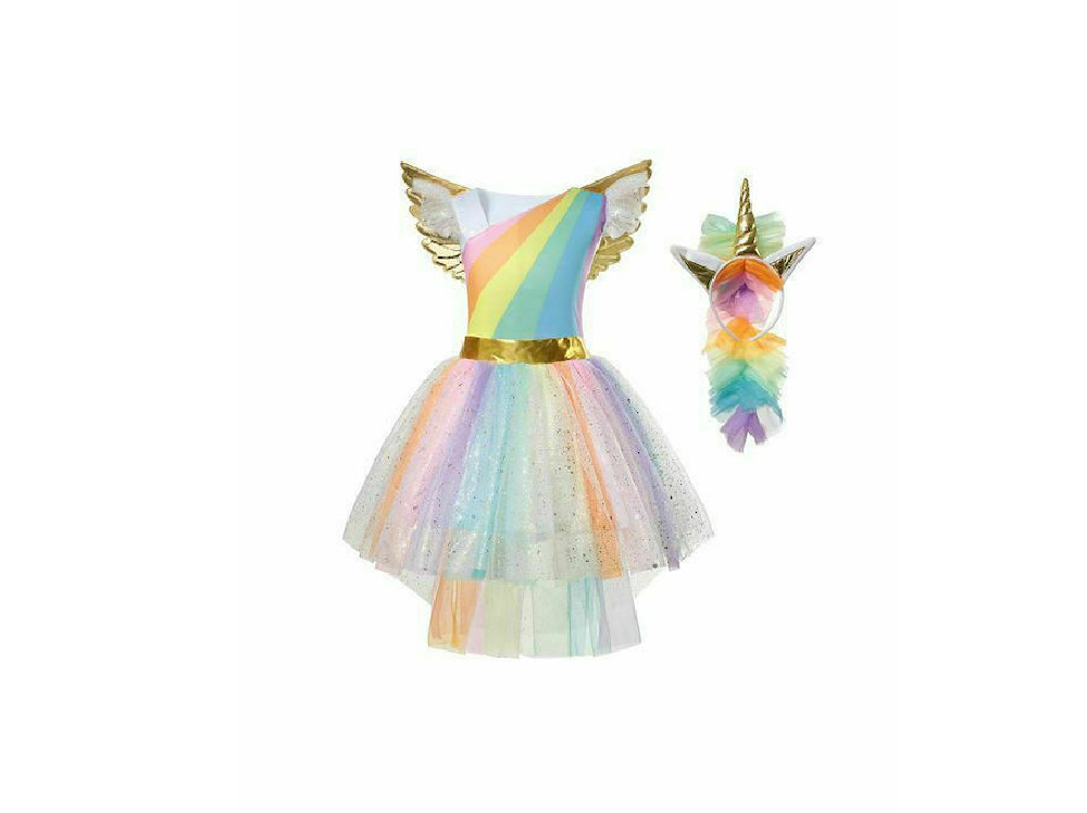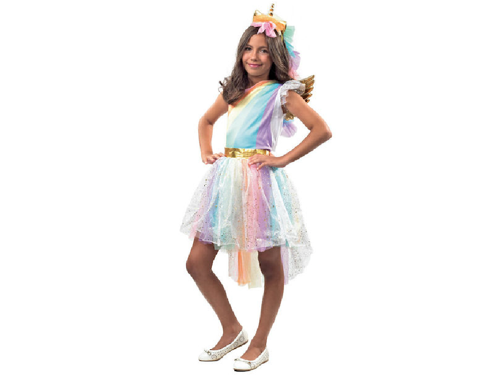 Από τις πιο περιζήτητες στολές μεταμφίεσης, για τη φετινή χρονιά, η στολή Μονόκερος με υπέροχο χρωματιστό φόρεμα με φούστα τούτου, φτερά και στέκα μονόκερου για μια τέλεια εμφάνιση!